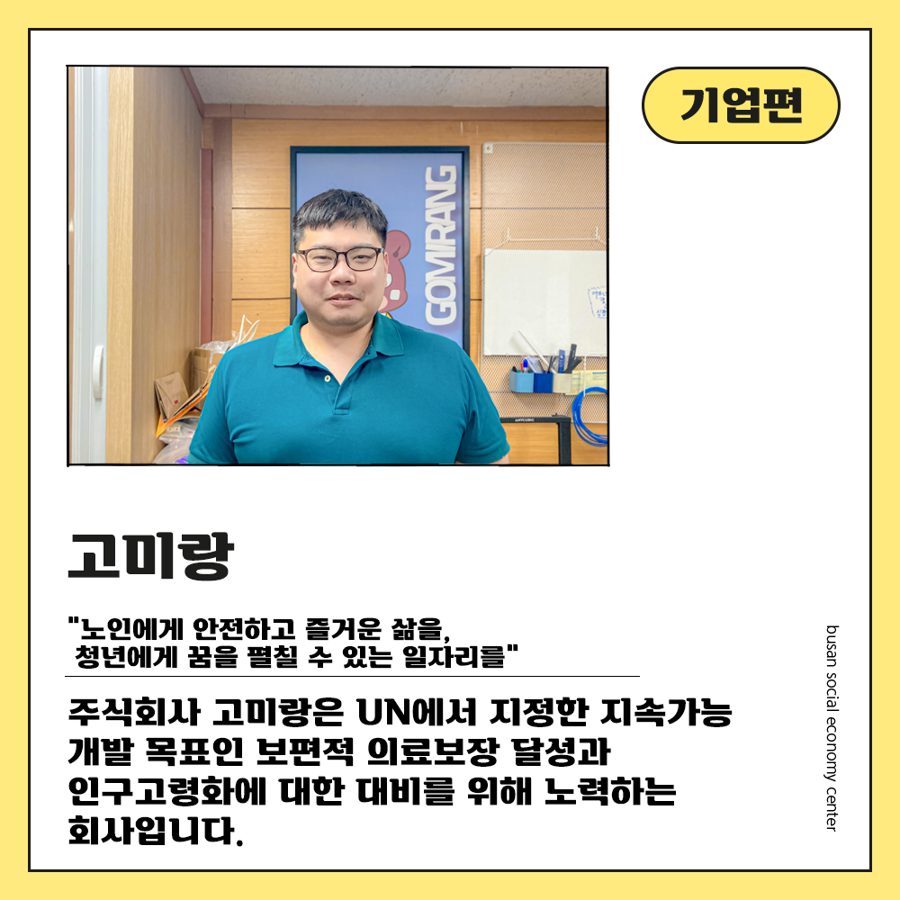 주식회사 고미랑은 50세 이상의 1인 가구를 위한 라이프케어 솔루션을 제공하고 있는데요. UN에서 지정한 지속가능 개발 목표인 보편적 의료보장 달성과 인구고령화에 대한 대비를 위한 방안을 고민하고 있습니다. 고령화 도시 부산에서 노인들에게 안전하고 즐거운 삶을 제공하면서 그 일들이 청년들에게는 꿈을 펼칠 수 있는 일자리로 이어지게 하고 있는데요.