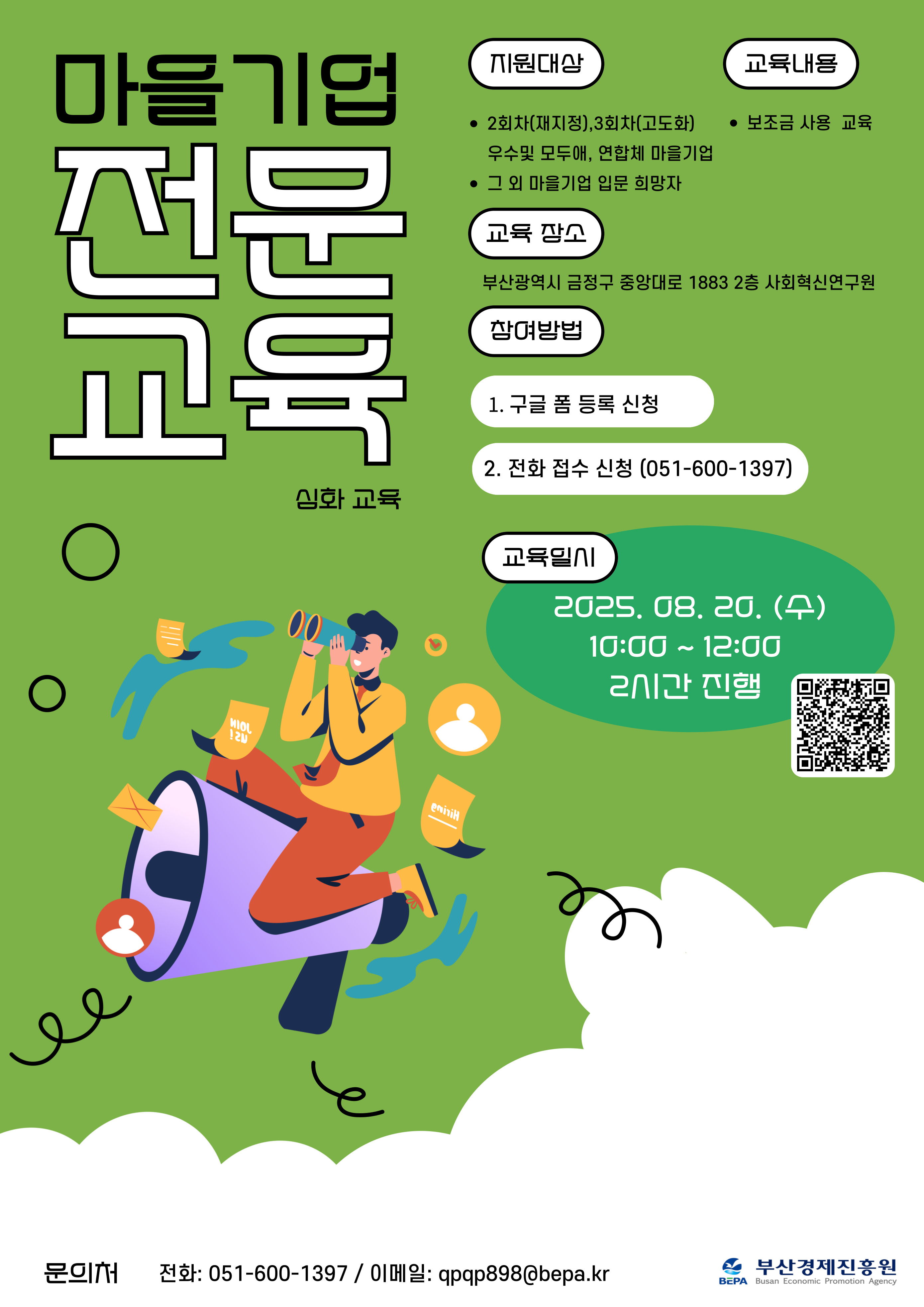2025 마을기업 역량강화 교육 전문(심화) 교육생 모집 공고 안내 1. 교육목적 : 2026년도 마을기업 지정 신청을 위해서는 총 2회에 걸쳐 진행되는 마을기업 전문교육(기본, 심화)을 반드시 이수하여야 합니다. 2. 교육명 : 마을기업 역걍강화 교육 전문(심화) 3. 교육대상 : 2회차(재지정),3회차(고도화), 우수및 모두애, 연합체 마을기업 그 외 마을기업 입문 희망자 4. 교육 일시 : 2025.08.20.(수) 10:00 ~ 12:00 (2시간) 5. 교육 장소 : 부산광역시 금정구 중앙대로 1883, 2층 사회혁신연구원(참여자가 많을 시 장소 변경 가능 有) 6. 이수 요건 : 회원 3인 이상 참석 (대표자 및 실무책임자 필수 참석) 7. 교육 내용 : 보조금 집행 시 유의사항 등 -교육 이수 후 수료증 발급 예정 참여신청 (구글폼 작성) : https://forms.gle/3cv3NdqQXfTR7yPcA ※ 문의사항 → 부산경제진흥원 마을기업 담당 서수민 주임, 051-600-1397, qpqp898@bepa.kr