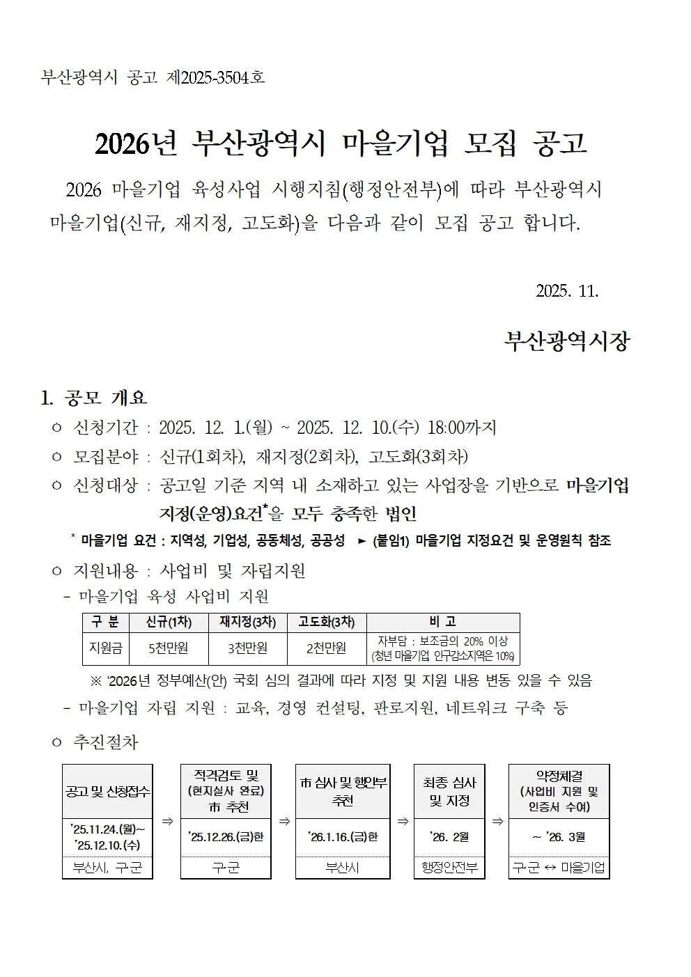 3. 신청대상 : 공고일 기준 부산 내 소재하고 있는 사업장을 기반으로 마을기업 운영원칙 및 요건을 모두 충족한 법인